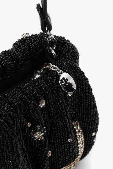 تحديث مطرز يدويًا لحقيبة التوقيع الخاصة بنا. الفاصوليا المزيّنة بالخرز هي الحقيبة المسائية المثالية ، على شكل كوكبة من حجر الراين. يتميز هذا النمط بهلال من حجر الراين على ظهره.