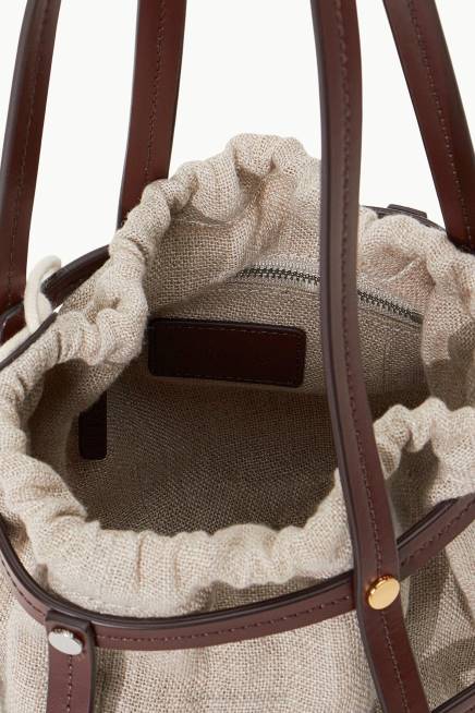 حقيبة دلو قابلة للتحويل مع الجزء الخارجي من الجلد المبرشور في قفص ، وتتميز حقيبة Ellie بحقيبة من الكتان قابلة للإزالة وأحزمة قابلة للتعديل. Span>