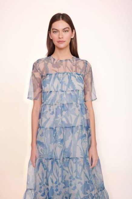 فستان الياقوتية المصنوع من الأورجانزا الشفافة من الفستان الطويل المتدرج مع زر إغلاق خلفي واحد. يتضمن هذا النمط زلة داخلية قابلة للإزالة.