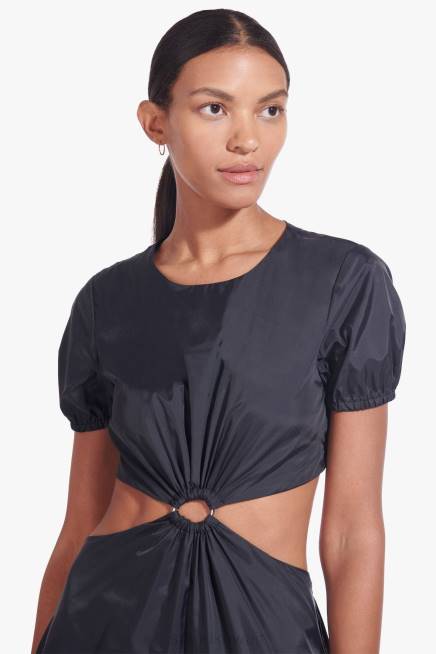 فستان كاليبسو هو فستان متوسط الطول مصنوع من نسيج النايلون المستدام المعاد تدويره. هذا الفستان متعدد الاستخدامات تمامًا للارتداء لأعلى أو لأسفل ويتميز بأكمام قصيرة وظهر مفتوح وقصّة على الخصر مع تفاصيل خاتم. P>