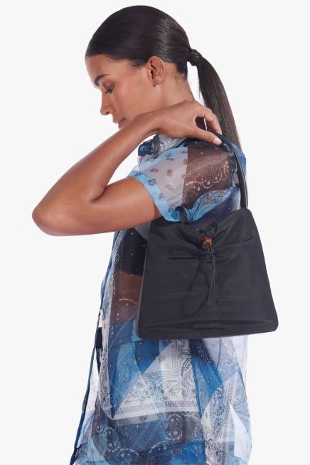 أحدث حقائب فيليكس لدينا مصنوعة من نفس نسيج النايلون المتين مثل الملابس الجاهزة لدينا. تتميز حقيبة الكتف هذه بسحاب للإغلاق ورباط من الحبل مع تفاصيل صدف السلحفاة أسفل جسم الحقيبة.