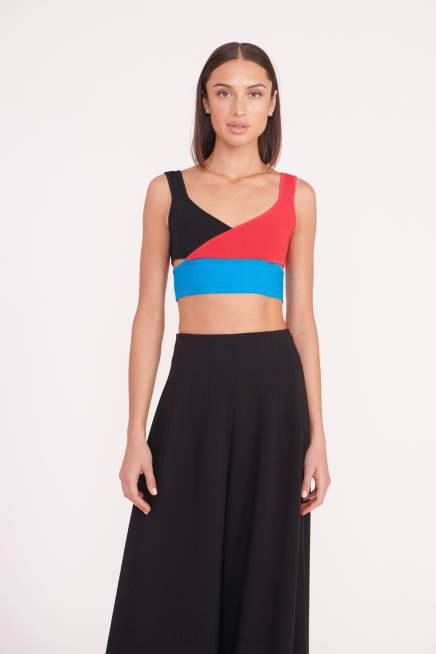 قطعة علوية محجوبة بالألوان مصنوعة من قماش محبوك مضغوط ومطاطي. يتميز الجزء العلوي من ترينتون بتفاصيل لوحة كروس أوفر ويكمل الطقم عند ارتدائه مع تنورة كارينا المطابقة.